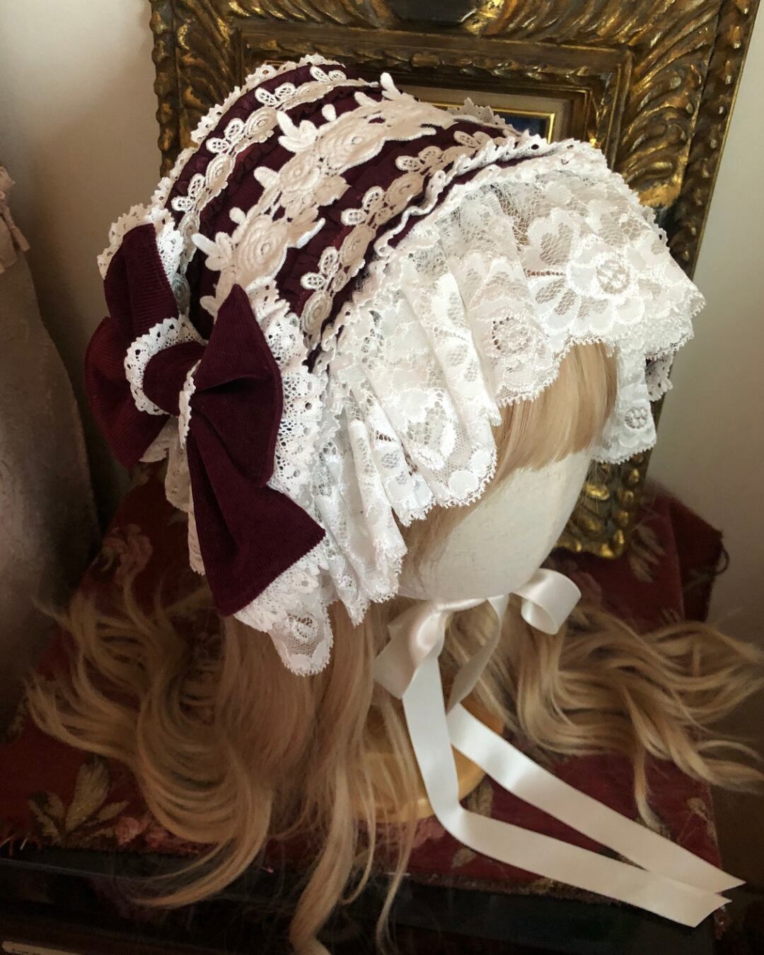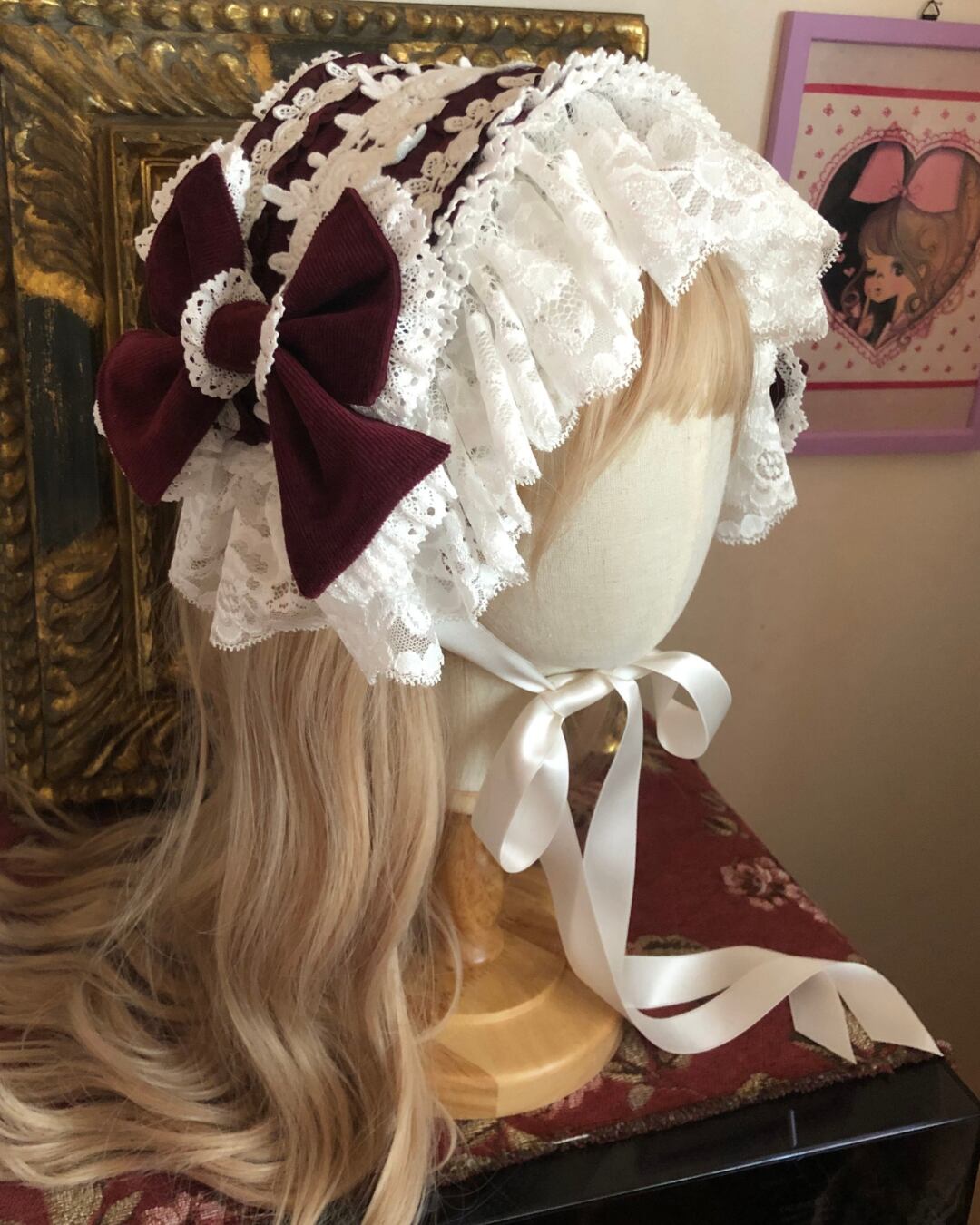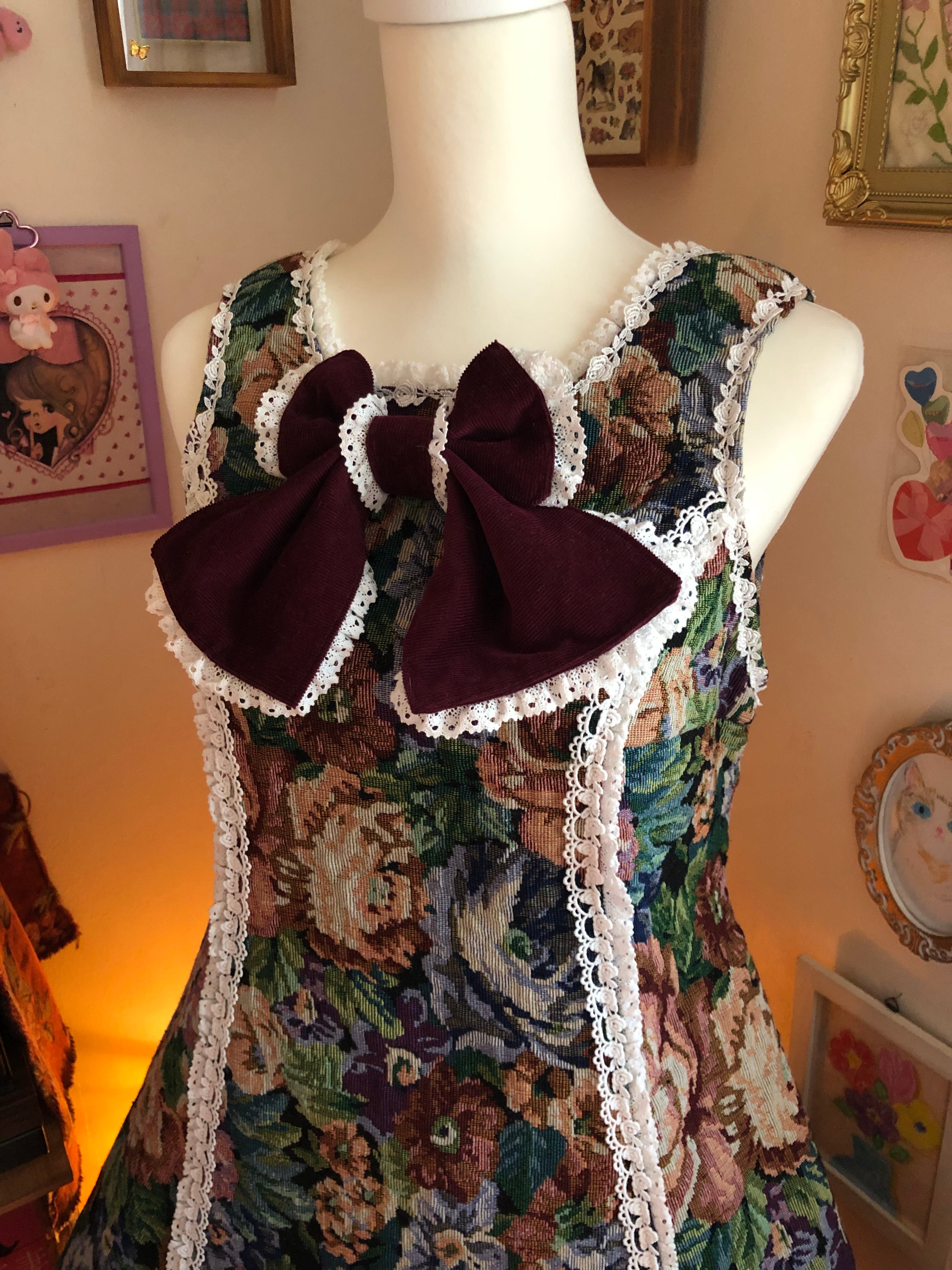 ゴブラン生地のリボンと薔薇レースのジャンパースカート&ボンネット風ヘッドドレス